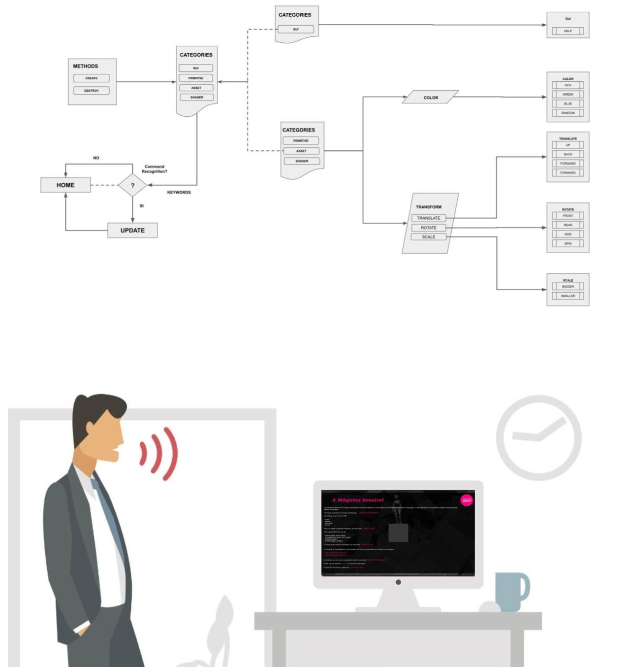 A Máquina Sensível is a multimedia project developed as part of doctoral research in digital media. This iteration explores the intersection of virtual environments and vocal interaction, utilizing Automatic Speech Recognition (ASR) to enable users to navigate and influence digital spaces. By implementing keyword and phrase-matching logic, the system facilitates a dynamic dialogue between human utterance and generative virtual response.